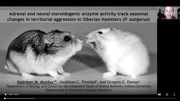 Kat received an Honorable Mention for the Division of Comparative Endocrinology’s Aubrey Gorbman Award for Best Student Oral Presentation at SICB 2022, the Society for Integrative and Comparative Biology’s annual meeting! In her presentation, Kat discussed her recent findings on how melatonin regulates seasonal and sex-specific changes in steroidogenic enzyme activity and aggression in Siberian hamsters. Congratulations, Kat!
