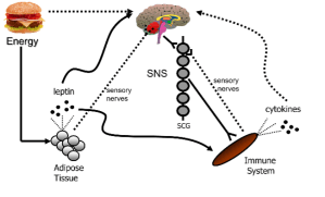 There are energetic tradeoffs between reproduction and immune function. The experimental reductions in total body fat suppress both reproduction and humoral immune responses, suggesting that immunity, like reproduction, tracks seasonal fluctuations in body fat. Despite the link between energy availability and immunity, the precise mechanisms by which energy availability (i.e., body fat) is interpreted by the brain and translated into a physiological signal indicating current energy balance were not fully understood. Siberian hamsters housed in short days display gonadal regression, decreases in total body fat, as well as reduced humoral immunity; exogenous leptin mimicking long-day levels of the hormone attenuated these immune impairments. We demonstrated that exogenous leptin increases circulating levels of the proinflammatory cytokine interleukin (IL) 1β while inhibiting the anti-inflammatory cytokines IL-4 and IL-12. We also demonstrated an important role for the SNS in leptin-induced immunoenhancement by showing in vivo, but not in vitro leptin-enhanced antibody production and that in vivo immune enhancement was blocked by either global chemical denervations or targeted surgical denervations of the spleen. More recently, our lab have been examining the contributions of specific energetic fuels and signals to seasonal variation in sickness intensity. We found that seasonal variation in sickness-induced hypothermia was regulated by seasonal changes in glucose availability and leptin levels; however, seasonal changes in sickness-induced anorexia and body mass loss were regulated by seasonal differences in body mass more generally. Insulin, a pancreatic hormone secreted in response to positive energy balance, has both suppressive and enhancing effects on sickness intensity, depending on energetic and reproductive context.
